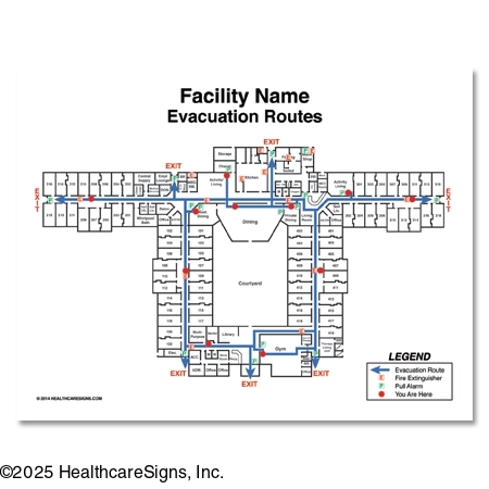 • Identifies "You Are Here" location, fire extinguishers, pull alarms, and escape routes.