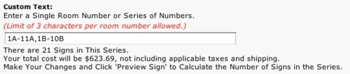 ANSWER: Enter series of numbers with a dash (ex: 1-10) or use commas to separate individual numbers (ex: 1, 10, 35). Room numbers can be combined as well (ex: 1-10, 12, 14, 16, 24-30). Please enter all room numbers needed in this style. You may also add a character prefix or suffix to a series (ex: 1A-10A, 2B-5B). Note that preview will only show the first item in the series.