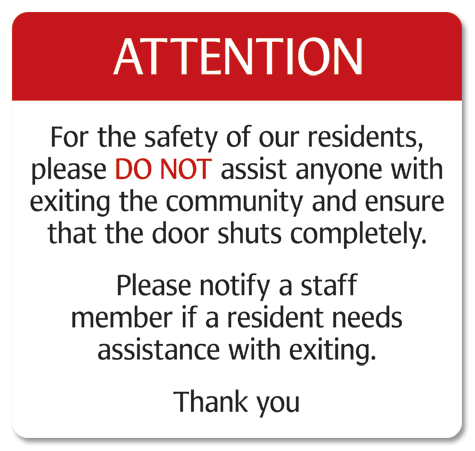 Custom sign information and spelling are the responsibility of client. Sonida Senior Living Signs can not be held liable for any errors entered by customer.